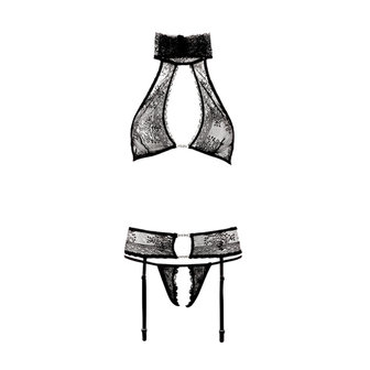 Hou je wel van een uitdagende outfit? Dan is dit kanten jarretelsetje echt iets voor jou. Dit uitgebreide setje bestaat uit een jarretelgordel, een string met open kruis en een top met halsband. De jarretelgordel en de top zijn aan de voorkant afgewerkt met diamantjes, wat het geheel een luxe uitstraling geeft. De top zit aan de achterkant vast met twee dunne bandjes die kruiselings over de rug lopen. Het setje is gemaakt van zwart kant en is elastisch, zodat hij altijd goed past.